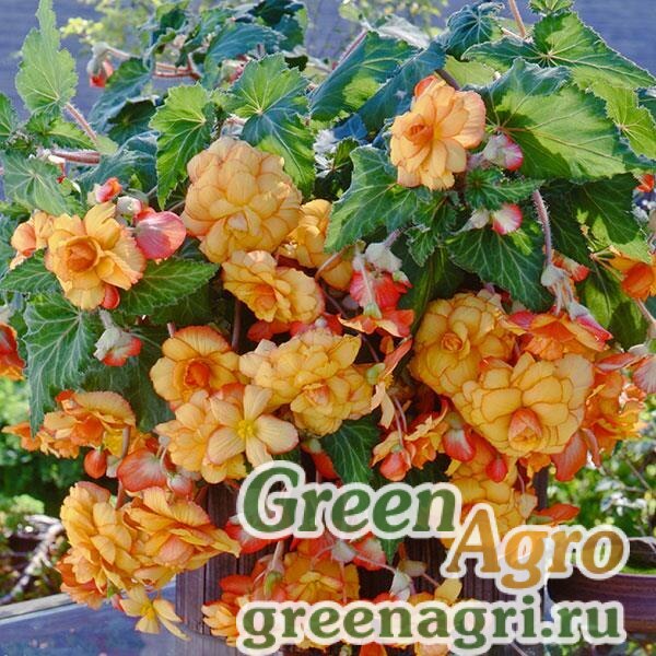 Ампельная клубневая бегония "Сан Дэнсер" формирует разветвленный плотный ниспадающий куст и быстро заполняет подвесную корзину. Цветение очень обильное. Цветы махровые, диаметром 5-13 см. Терпима к прямому солнечному свету!