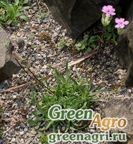 Многолетник растет в виде густого плотного кустика или подушки с деревянистым основанием. Листья узколанцетные, прикорневые и стеблевые. Цветоносный стебель 5-15 см высотой, обычно не ветвящийся, несущий две или более пары листьев. Пурпурно-розовые цветки 0,8-1 см в поперечнике, собраны по 3 в группы.